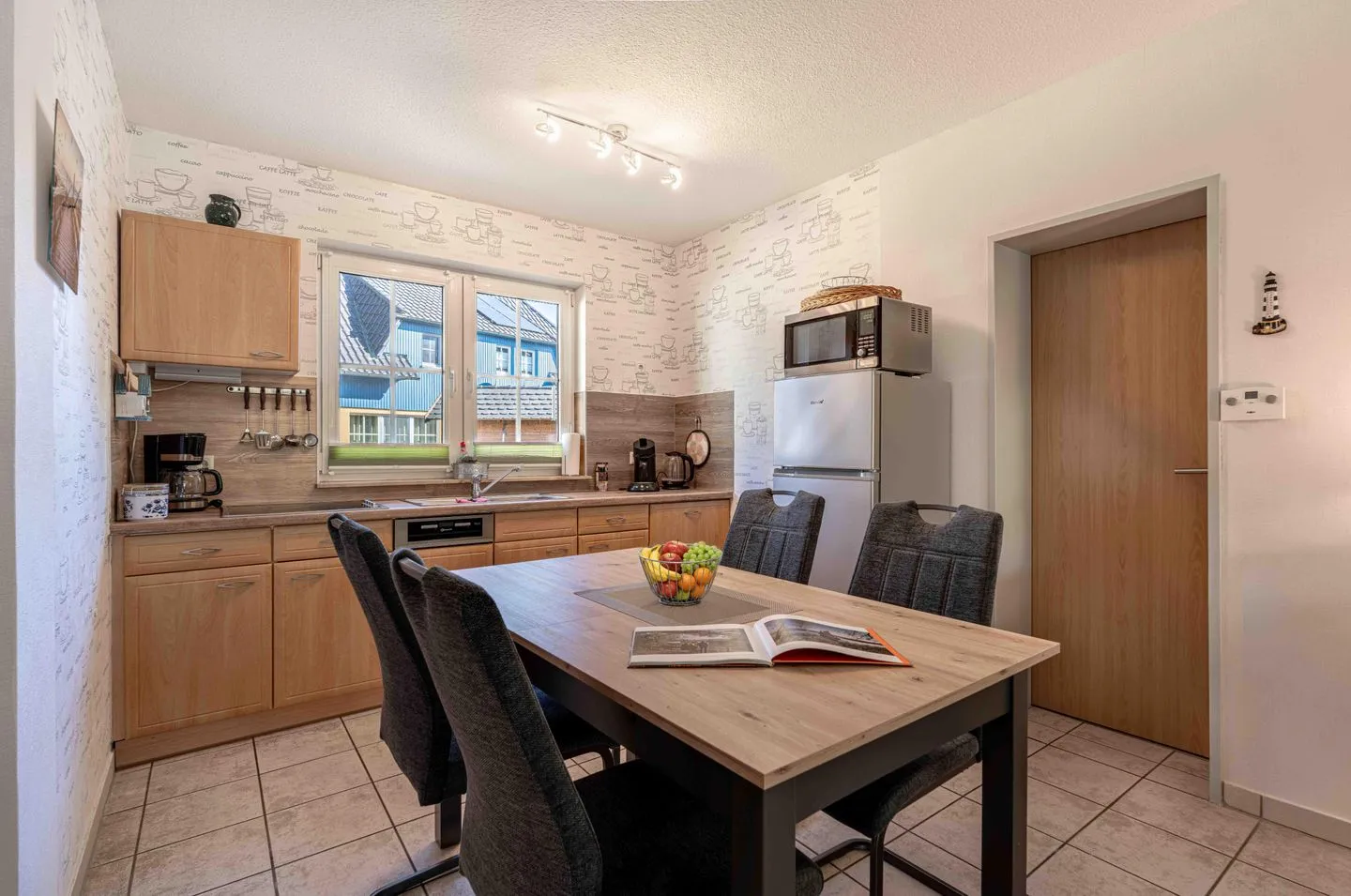Die offene Küche ist funktional und umfassend ausgestattet. Dazu gehören Cerankochfeld, Herd, Elektro-Backofenanschluss, Mikrowelle, Spülmaschine, Kühlschrank mit Gefrierfach, Kaffeemaschine, Senseo-Espressomaschine, Wasserkocher, Toaster, Mixer, Eierkocher sowie Geschirr, Besteck, Küchenutensilien und Geschirrhandtücher. Eine Erstausstattung ist ebenfalls vorhanden.