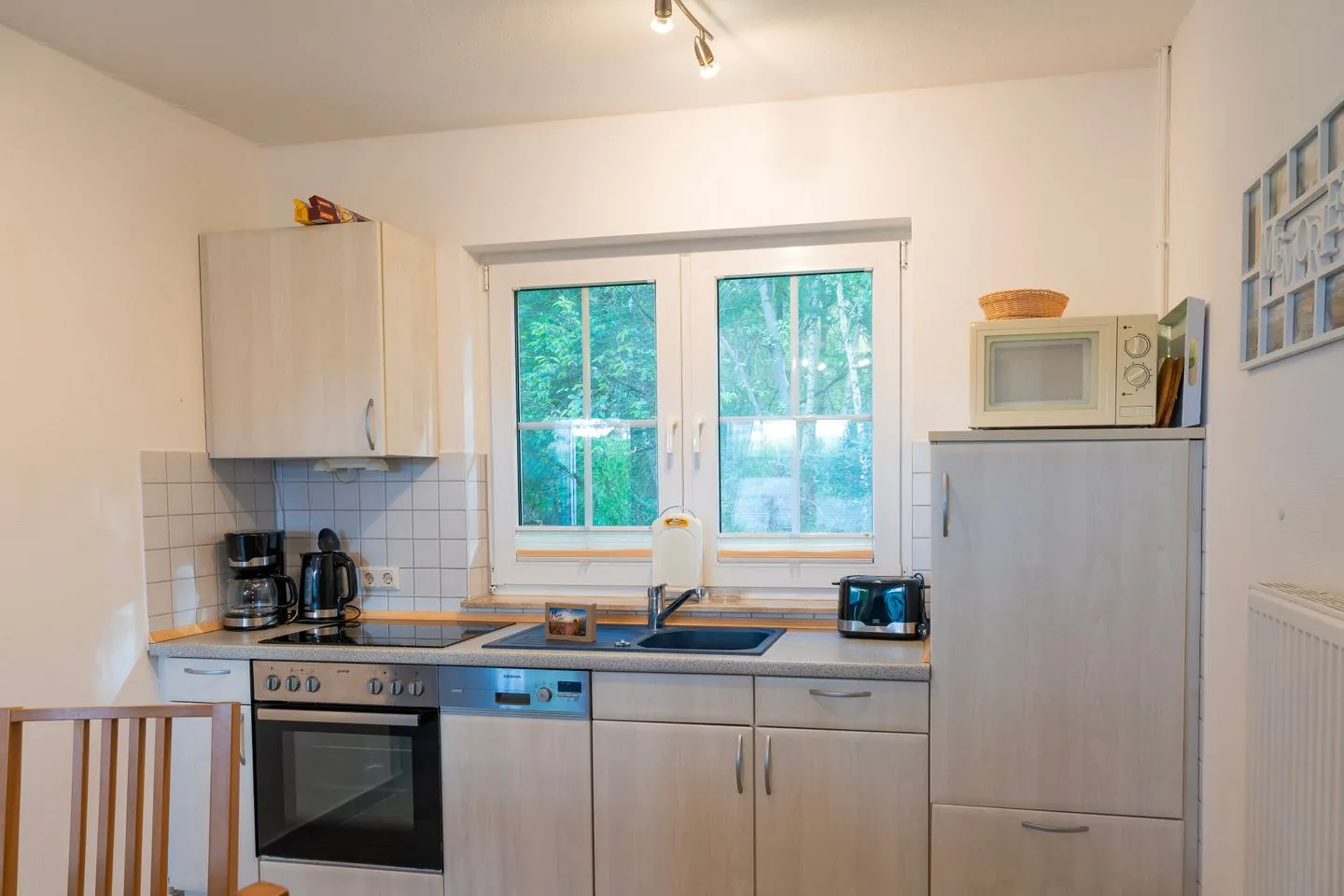 Die offene Küche bietet Ihnen alle Annehmlichkeiten, die Sie von einem komfortablen Ferienhaus erwarten: eine Spülmaschine, Kühlschrank mit Gefrierfach, Ceranherd, Backofen, Kaffeemaschine, Wasserkocher, Toaster sowie umfangreiches Geschirr und Küchenutensilien stehen zur Verfügung. Ein separater Essbereich mit großem Tisch lädt zu gemeinsamen Mahlzeiten ein.