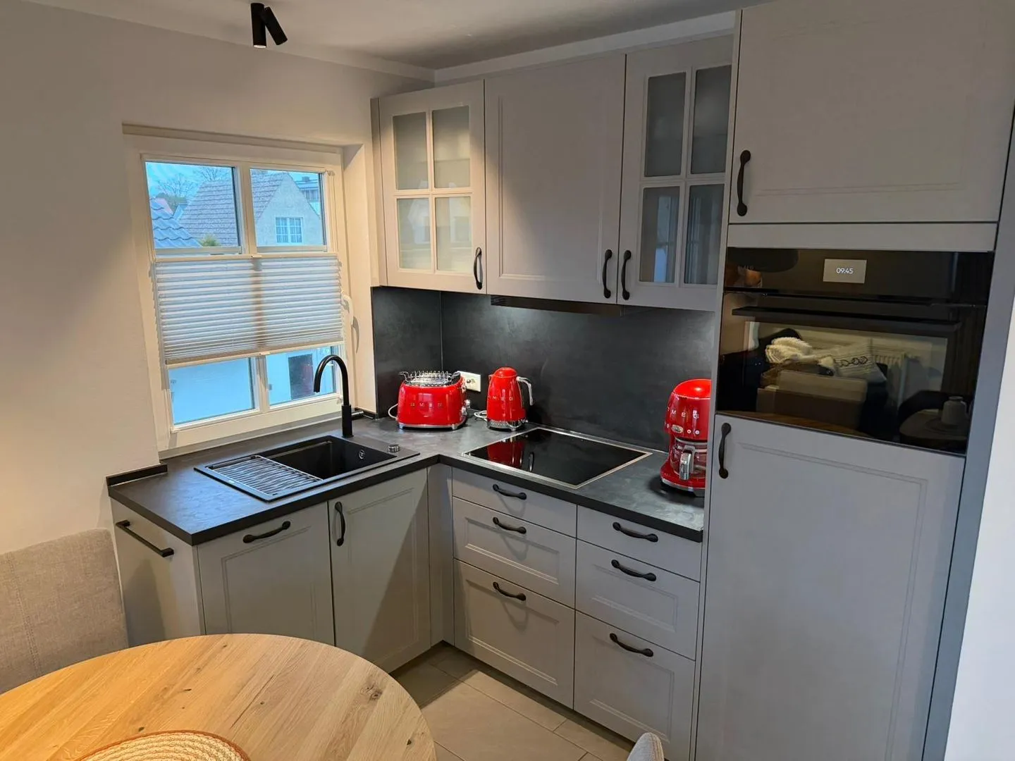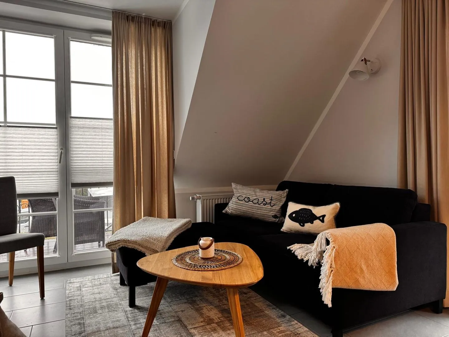 Die neu eingerichtete 50 m² Wohnung präsentiert sich im modernen maritimen Stil. Das lichtdurchflutete, helle Wohnzimmer lädt mit seiner bequemen Couch nebst großem Hocker zum Entspannen ein. Ein großer 55-Zoll-Fernseher, ein stilvolles Sideboard sowie ein praktischer Sekretär fügen sich harmonisch ein und schaffen eine warme, einladende Atmosphäre. Hochwertige Materialien und ein durchdachtes Design sorgen für ein sofortiges Wohlgefühl.