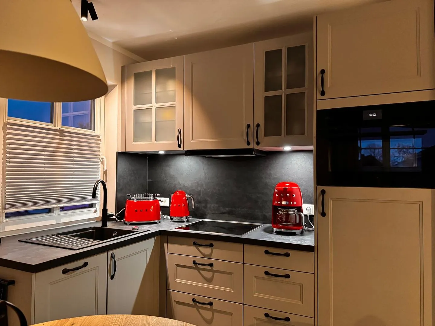 Der Essbereich bietet einen großen Esstisch mit vier komfortablen Stühlen. Die angrenzende Küche ist mit hochwertigen Küchengeräten ausgestattet und lässt keine Wünsche offen - ideal für gemütliche Kochabende.