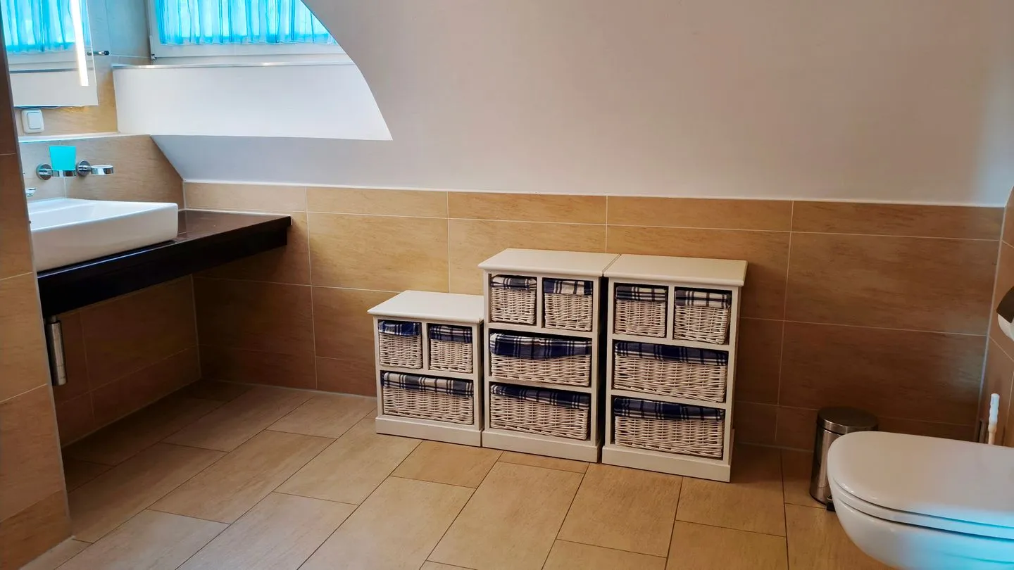 Das moderne Badezimmer bietet eine bodengleiche Dusche, Haartrockner, Waschbecken, Spiegel und Warmwasser. Fliegengitter an den Fenstern sorgen für einen entspannten Schlaf.