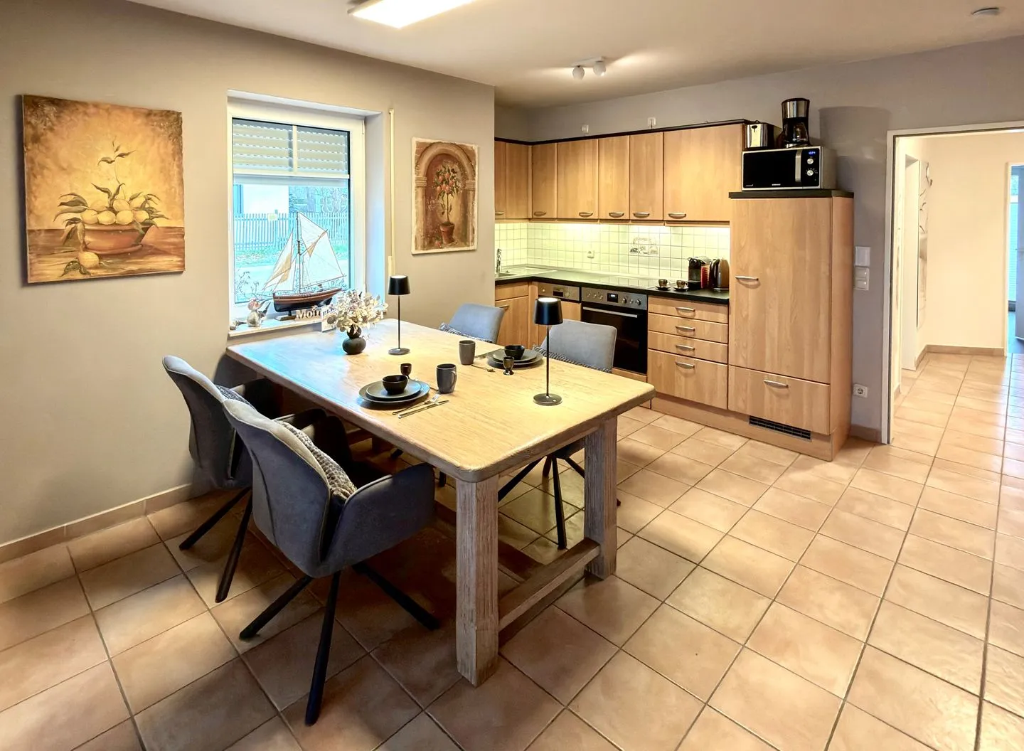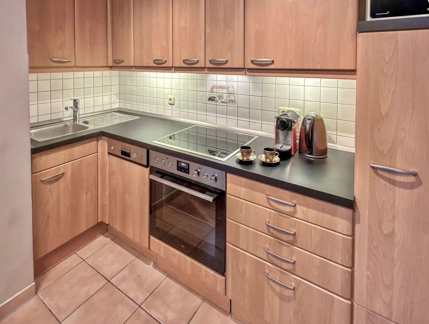 Die Küchenzeile ist ausgestattet mit einem großen Kühlschrank, Herd und Backofen, Dunstabzugshaube, Spülmaschine, Kaffeemaschine, Wasserkocher, Mikrowelle, Toaster, Tischgrill (dieser darf nur auf der Terrasse benutzt werden).