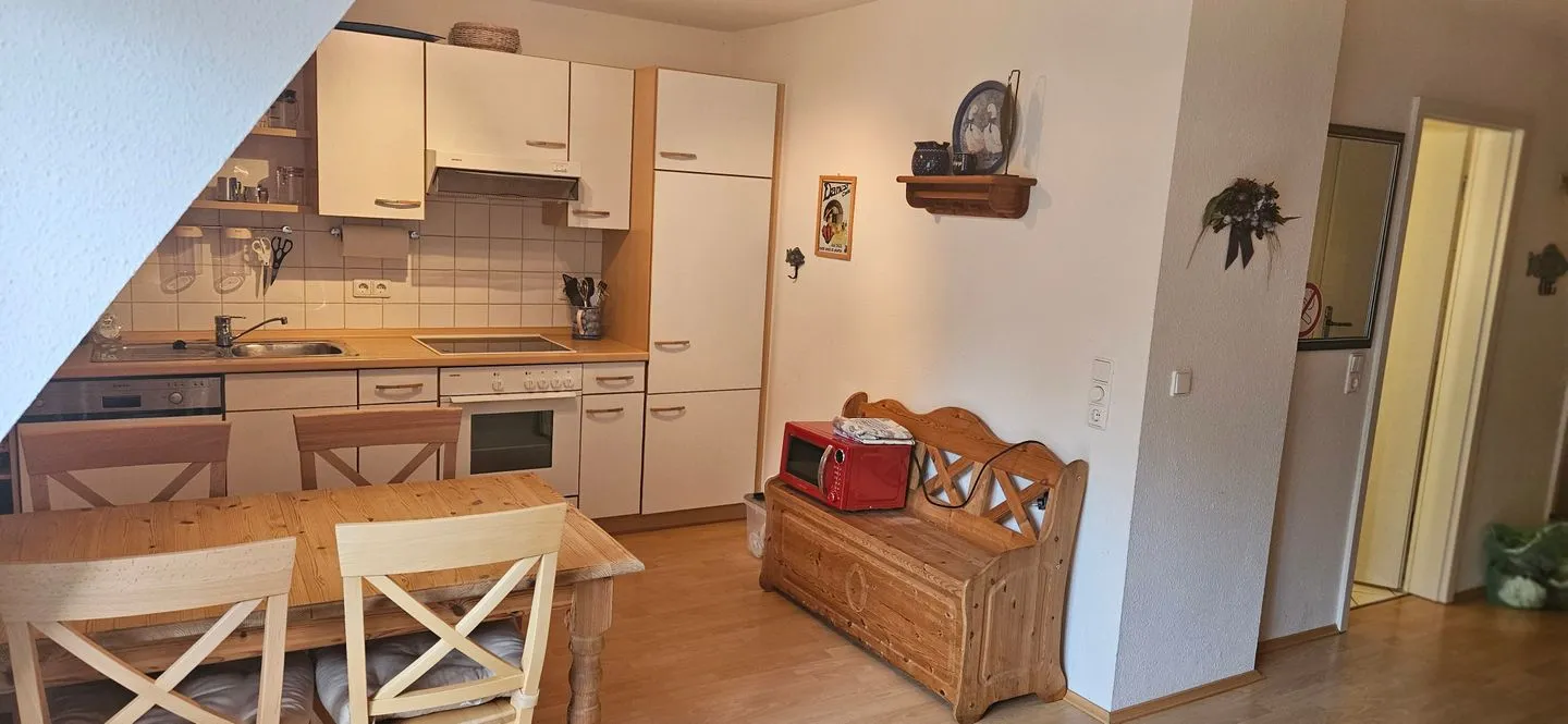 Die offene Küche ist zum Wohnzimmer hin gestaltet und mit allem ausgestattet, was Sie für die Selbstversorgung benötigen: Ceran-Herd, Backofen, Kühlschrank mit Gefrierfach, Spülmaschine, Mikrowelle sowie Kaffeemaschine, Wasserkocher, Toaster, Eierkocher und Mixer. Küchenutensilien, Geschirr und Besteck sowie Geschirrhandtücher und ein Essbereich mit Esstisch sind vorhanden – ideal für gemeinsame Mahlzeiten in der Wohnung.