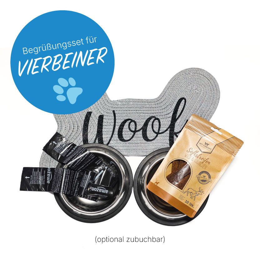 Enthalten sind: 2 Futternäpfe | 1 Unterlage | 2 Rollen Hundekotbeutel | 1 Portion Leckerlies - Preis: 15,– €